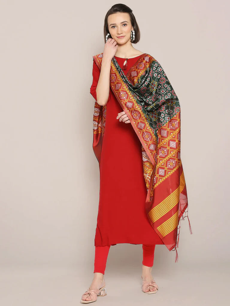 Add a touch of elegance to your wardrobe with this exquisite piece of beautiful Banarasi Silk Dupatta. Swathed with elegant Patola style weaving all over, this classic stunner is a must in your ethnic collection.