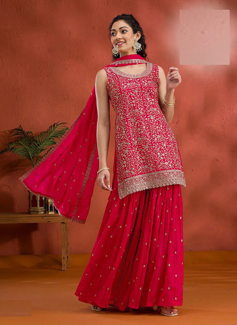 - This green georgette palazzo set embodies elegant charm and festive sophistication with intricate embroidery and sparkling sequin work. The rich shade of green brings a refreshing touch of grace perfect for celebrations and traditional gatherings.