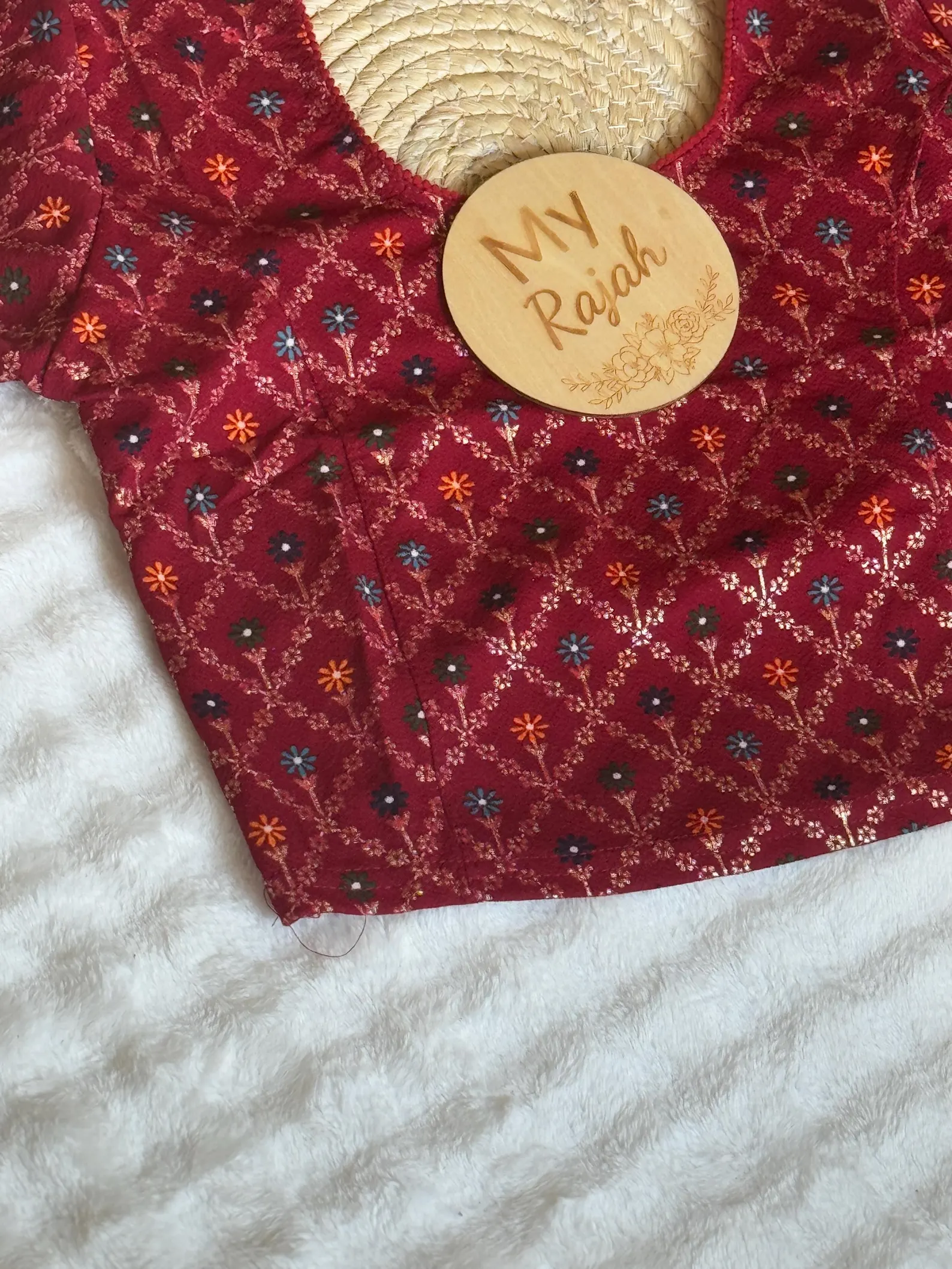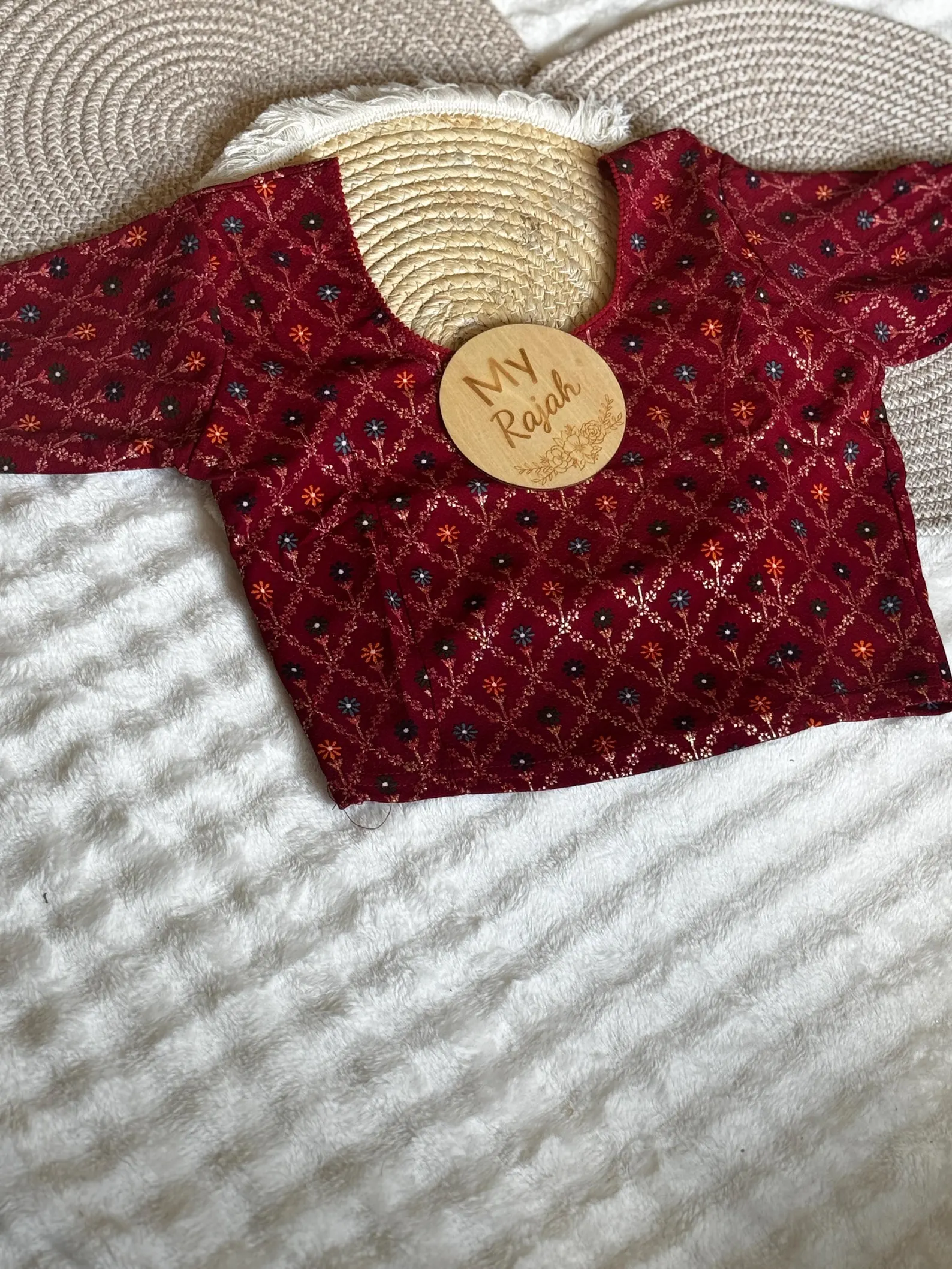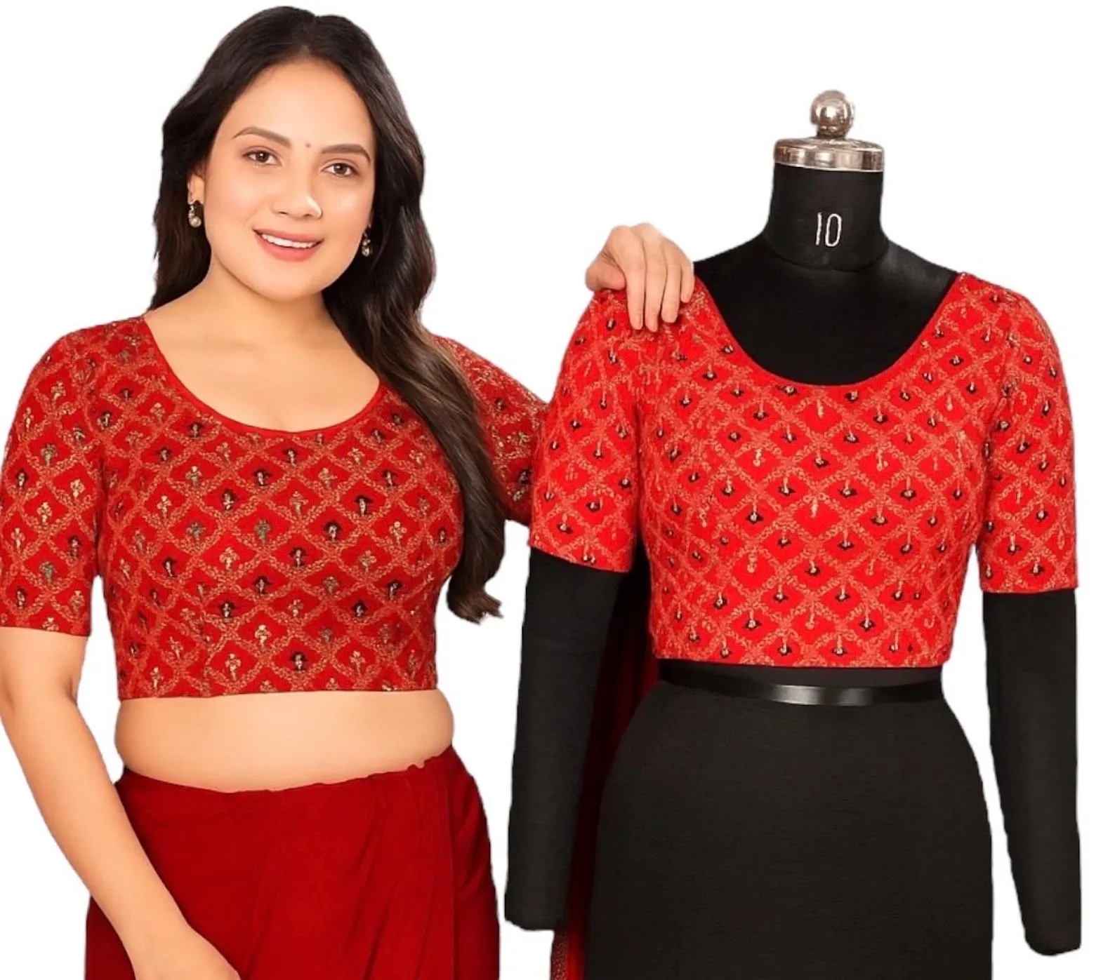 Elevate your ethnic wear collection with our beautifully crafted stretchable traditional blouse, designed for both style and comfort. Featuring a rich geometric floral pattern in shimmering gold, pink, blue, and orange tones, this blouse is available in two elegant base colors: Red.